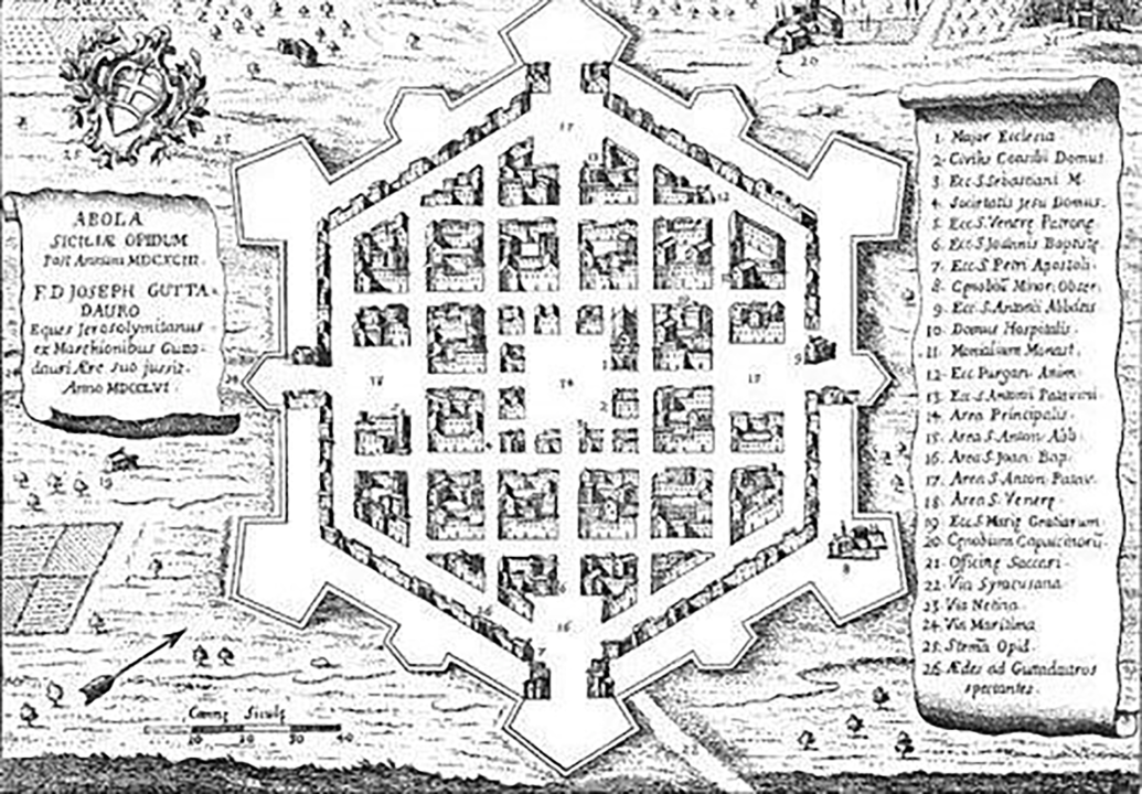 Il disegno delle piazze collocate in sequenza e legate da un unico asse rimanda al piano di Avola e avvalora l’attribuzione del progetto all’architetto gesuita Angelo Italia.