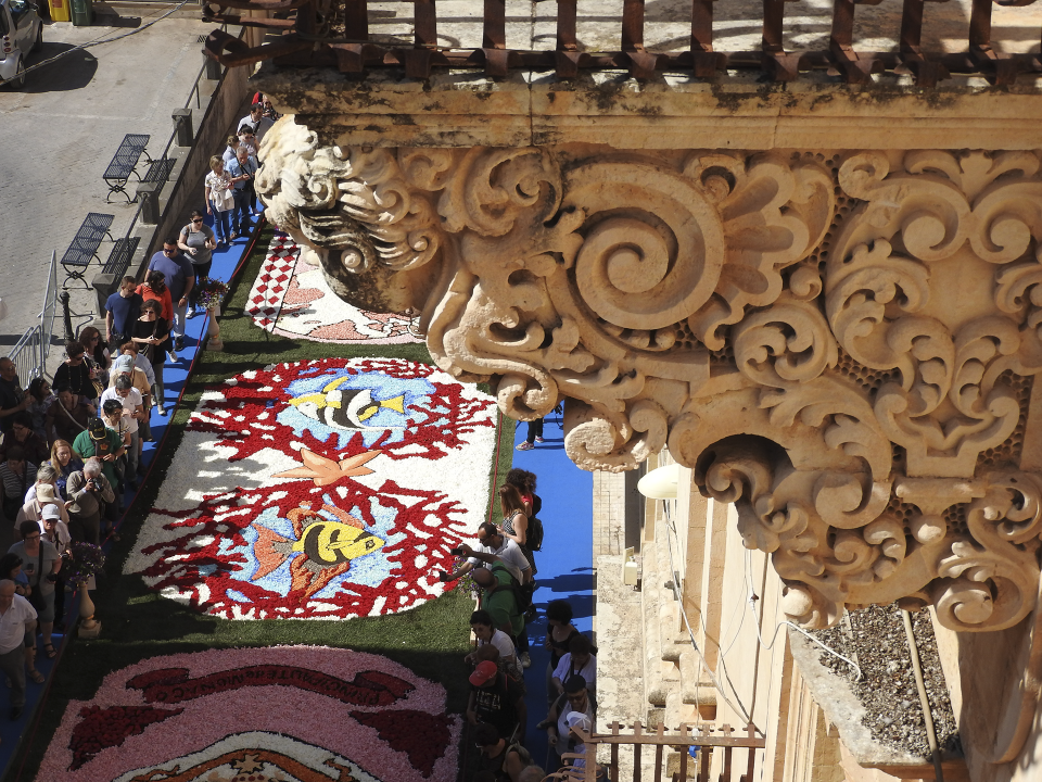 In tutto l’altopiano ibleo, il mese di maggio era il mese dedicato alla Madonna e, in suo onore, le donne amavano addobbare l’ingresso delle loro case con fiori di campo “u ciuri i maju”. L’idea dell’Infiorata a Noto nacque negli anni ‘80, intesa come una festa di colori e di fiori che salutano la primavera in Via Nicolaci, uno dei luoghi simbolo del sud est barocco. Furono i maestri di Genzano in collaborazione con gli infioratori locali a dare inizio a questa eccentrica e colorata consuetudine. Il giorno prima dell’evento, vengono assegnate le aree ad ogni maestro che traccia le prime linee bianche per fare intravedere le figure finali. Poi vengono deposti, ad uno ad uno, migliaia di fiori e le figure cominciano a prendere vita. Così la terza domenica di maggio, Noto si trasforma da giardino di pietra a festa dei colori e degli odori.