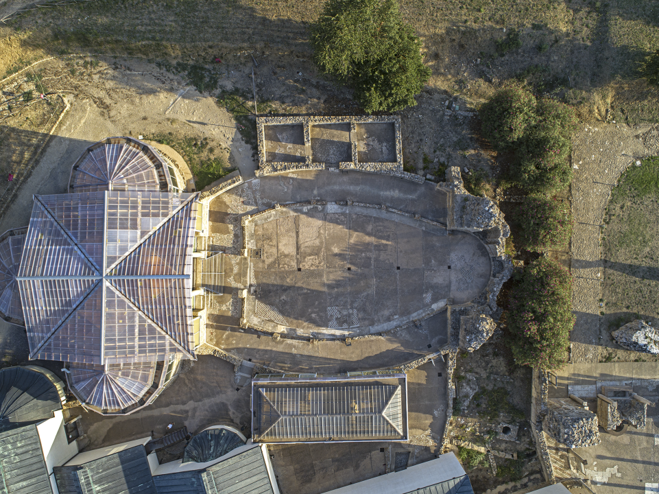 Questa imponente architettura dalla planimetria ellittica si articola lungo tre portici a pilastri. Si presume che i pilastri del porticato dovessero sorreggere una copertura lignea a pergolato, che creava un ideale luogo per il passeggio, allietato dai giochi d’acqua delle fontane che si disponevano entro il cortile scoperto, forse utilizzato per spettacoli di danza o giochi acquatici. Gli spazi tra le colonne erano chiusi da muretti, eccetto quelli mediani utilizzati come punti di passaggio. Testimonianze archeologiche fanno, però, ipotizzare la loro chiusura con lastre inserite nelle soglie per i giochi acquatici, resi più scenografici dalla presenza di tessere musive disposte a spina di pesce, dai colori digradanti, che dovevano simulare le onde del mare.